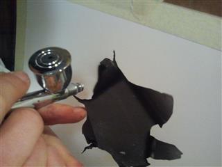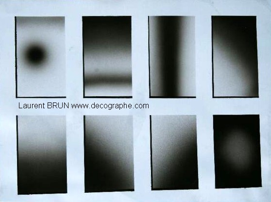 Le film de masquage, les scotchs de peintures et de carrosseries, du Sopalin, des pochoirs de tout types, que je me fabrique avec un cutter et du canson épais.