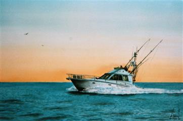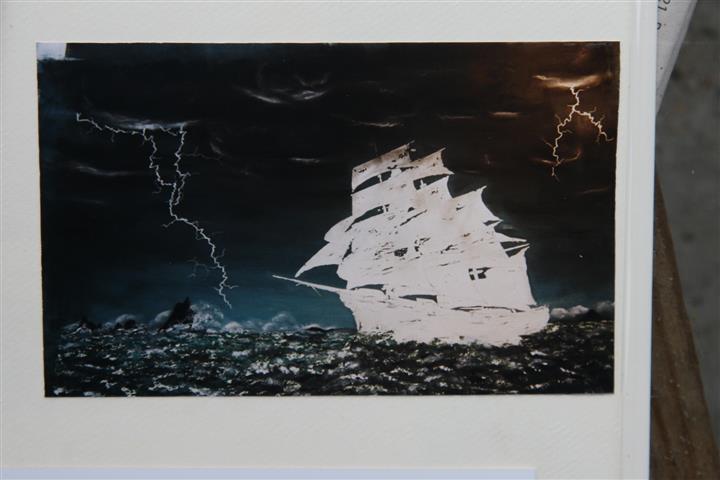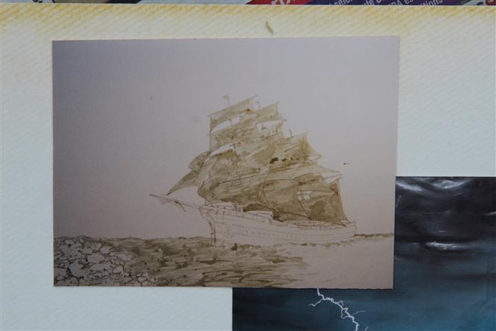 Puis, j'ai enlevé la gomme liquide pour peindre à la gouache et à l'acrylique le voilier. Pour la première fois, j'essaye de peindre des vagues déchainées !