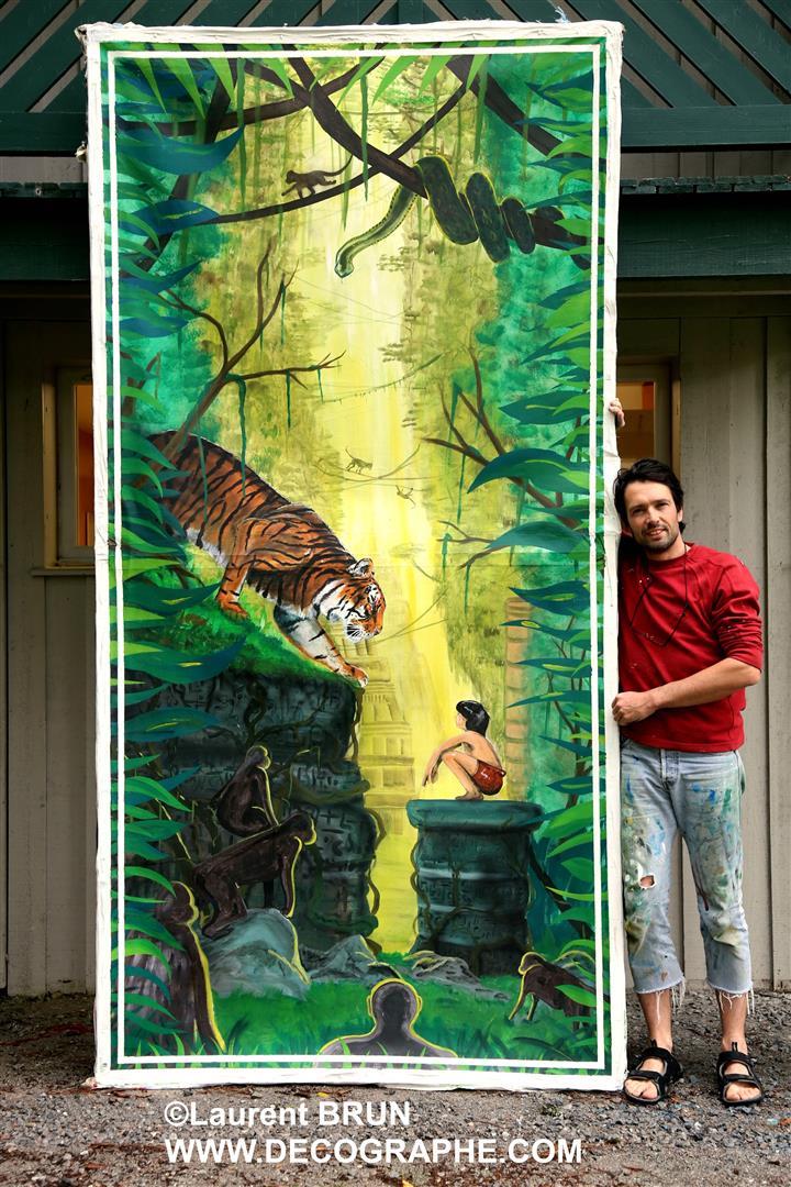 Beaucoup d'aérographe et du pinceau en partant des montagnes du fond pour arriver à l'arbre au premier plan.Ce panneau fait parti du spectacle du Roi Lion,
