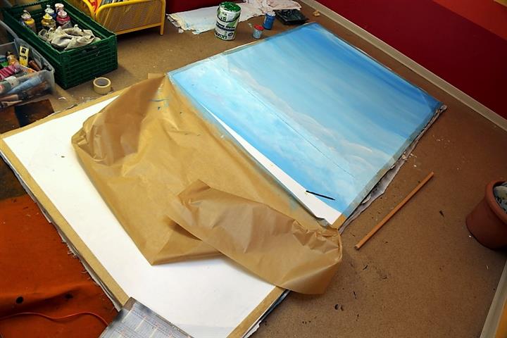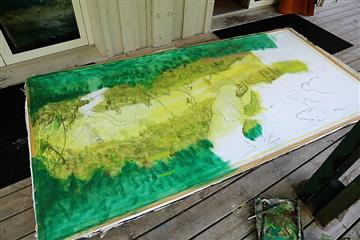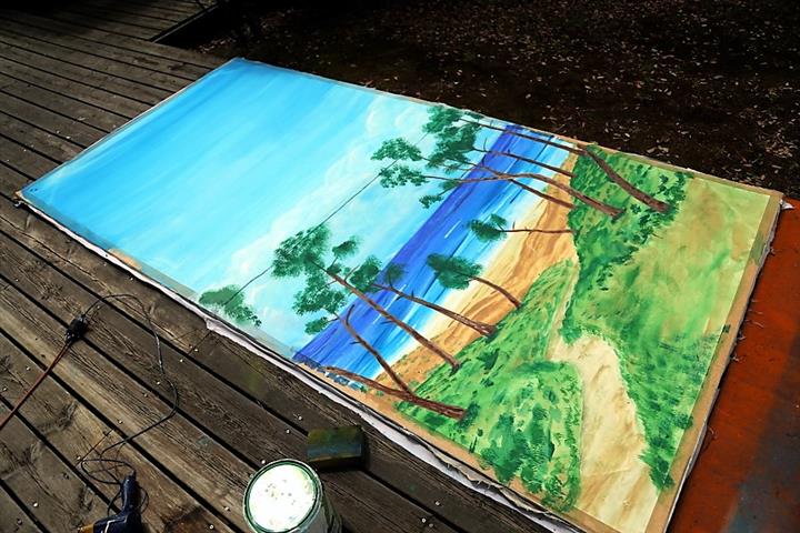 2 - peinture de l'océan et du sable à l'éponge puis la fôret au pinceau