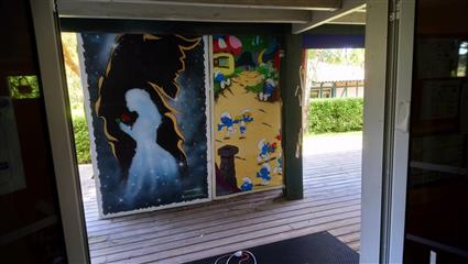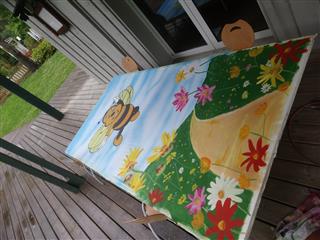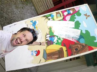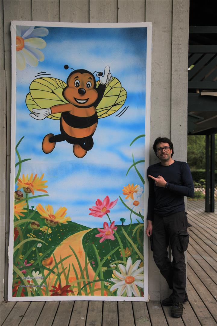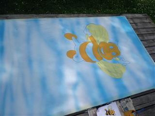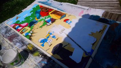 J'ai été obligé de repeindre cette vilaine abeille qui est la mascotte du Pierre et Vacances (qui commande mes toiles) sur le magnifique décor des schrompfs de l'année dernière.