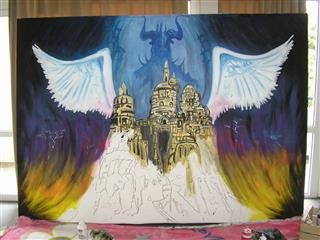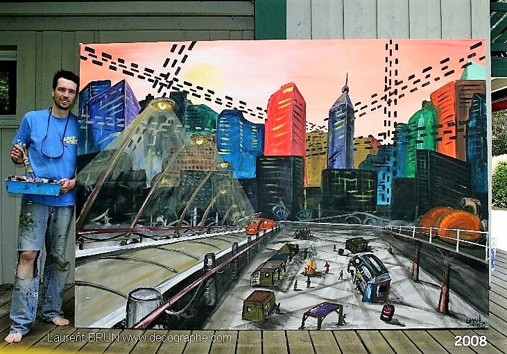 Décor que j'ai dessiné et que les enfants du Club de Vacances ont peint avec des chiffons mouillés