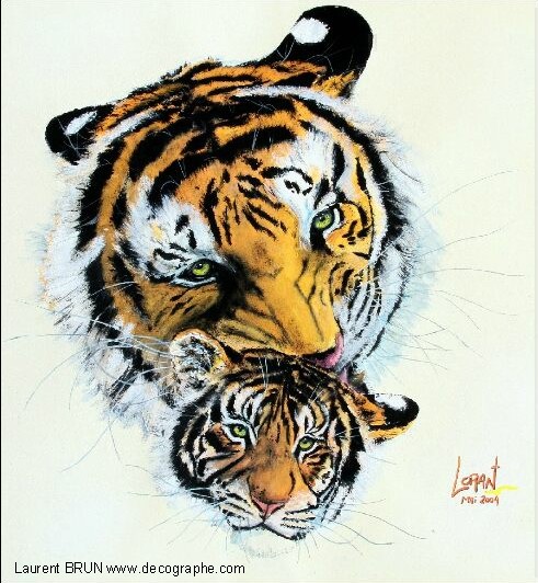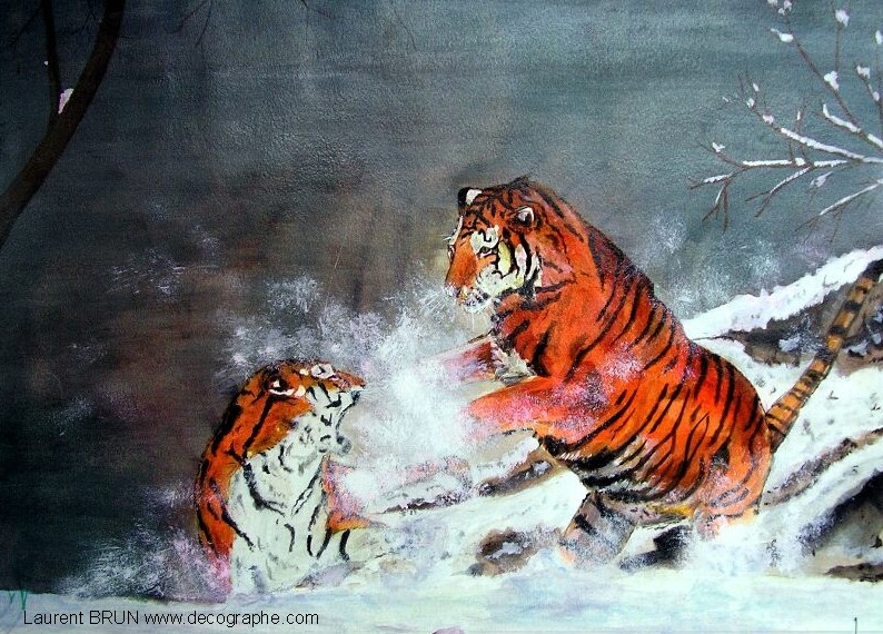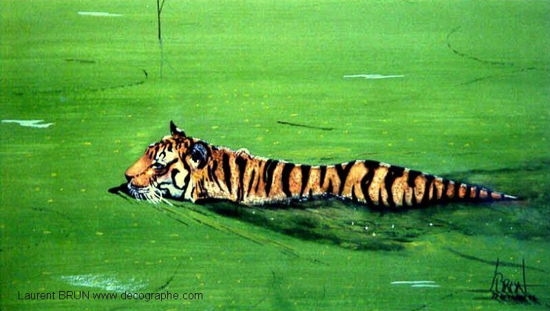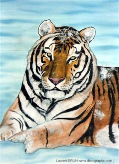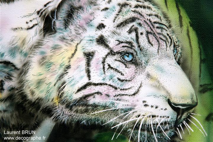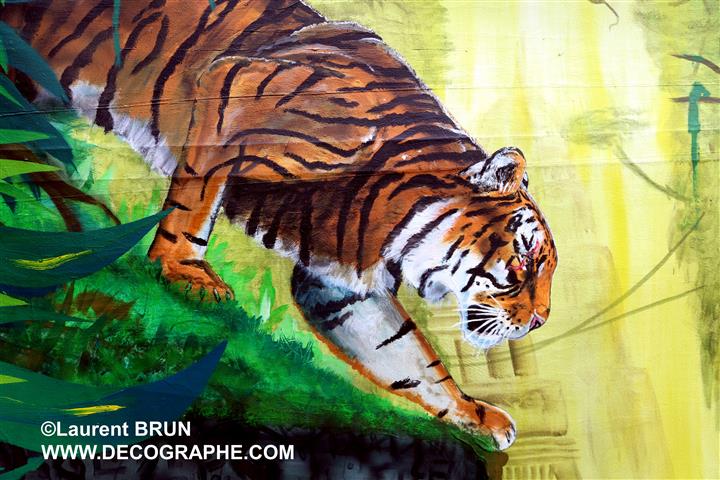 Le Tigre est dessiné sur le papier. En premier lieu, je masque les yeux, les dents et les moustaches à l'aide de scotchs. Puis je masque le tigre en entier pour pulvériser à l'aérographe le fond. Je crée des pochoirs d'arbres et de branches découpés sur mesure au scalpel. Je les applique à distance du support pour donner l'impression de flou. Puis je donne sa couleur au Tigre et à l'aide de pinceaux utilisés en pointillisme, je donne l'impression de fourrure. A d'autres endroits, les pinceaux brosse permettent les longs poils. Puis je m'occupe du regard. Ensuite la langue est peinte en entier dans la bouche. Je dégrade à l'aérographe avec du noir l'ombre dans la bouche. C'est qu'ensuite que je décolle les scotch qui protégeaient les dents ainsi toutes blanches. Je les peins, leur donne leur ombrage et les rayes dans leur longueur à l'aide de la gomme électrique. Je m'occupe de peindre le rocher et de le rayer avec du spontex et la gomme électrique. Je fini la gueule du Tigre et enfin je peaufine le décor. 4 jours de travail.