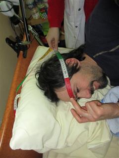 Adrianos, le Docteur, s'occupe de moi, m'ausculte les yeux, me questionne sur mon mal de tête. Je passe 1 heure avec un masque de nuit car la luminosité me fait mal à la tête. Il revient avec une vidéo pour me montrer la manipulation à faire pour ré-équilibré les cristaux dans l'oreille.