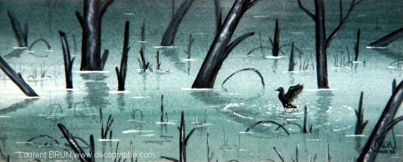 Pour obtenir la végétation au fond dans un style aquarelle, j'avais mis mon dessin fraichement peint dans le tiroir à chaussure du grand poêle qui chauffait l'escalier et l'étage chez mes grands-parents !